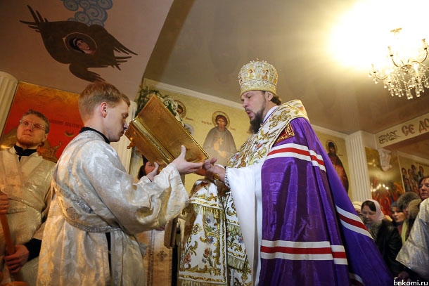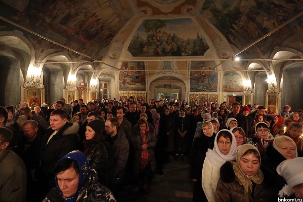 Как показалось корреспонденту БНК, в это Рождество в Свято-Стефановский кафедральный собор пришло меньше народу, чем год назад. Новогодняя атрибутика была и на территории храма, и внутри него. В соборе стояла красивая новогодняя елка, сама служба проходила в нижнем приделе собора. Вел богослужение епископ Сыктывкарский и Воркутинский Питирим.