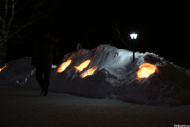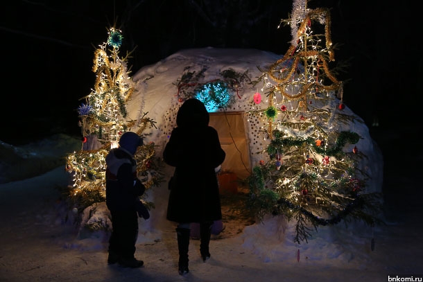 Свято-Казанский храм в Кочпоне и вовсе оказался окружен цепочкой вертепов, сделанных в снежных сугробах. На территории храма стояла новогодняя елка – металлический треугольный каркас, плотно обвитый гирляндой зеленых лампочек. Перед входом в храм стояли снежные фигурки двух ангелов.