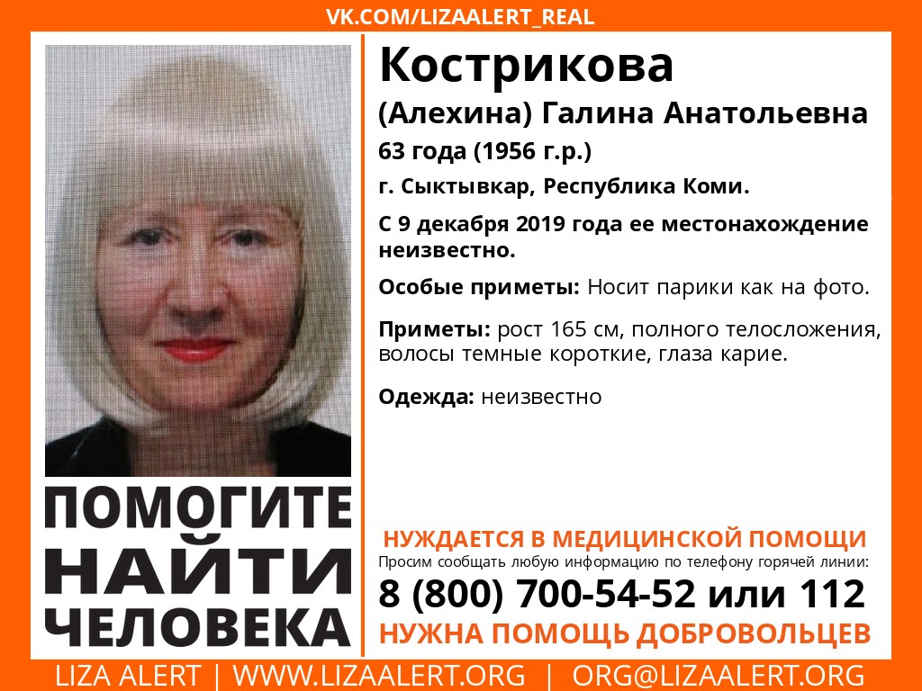 В Сыктывкаре в розыск объявлена 63-летняя Галина Кострикова. Женщина нуждается в медицинской помощи.