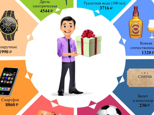 В списке традиционных подарков - электрическая дрель за 4544 рубля, наручные часы стоимостью 1990 рублей, туалетная вода - 3716 рублей, коньяк - 1320 рублей, смартфон - 8860 рублей, ремень - 757 рублей, футбольный мяч - 1127 рублей, билет в кино - 230 рублей.