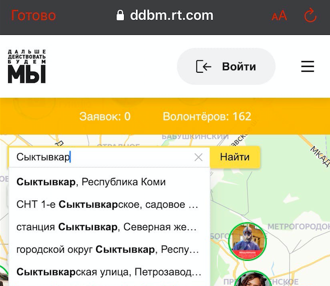Тем, кто готов помочь следует авторизоваться, отметить свою геолокацию, после чего на карте откроются точки и контакты тех, кому нужна помощь поблизости.