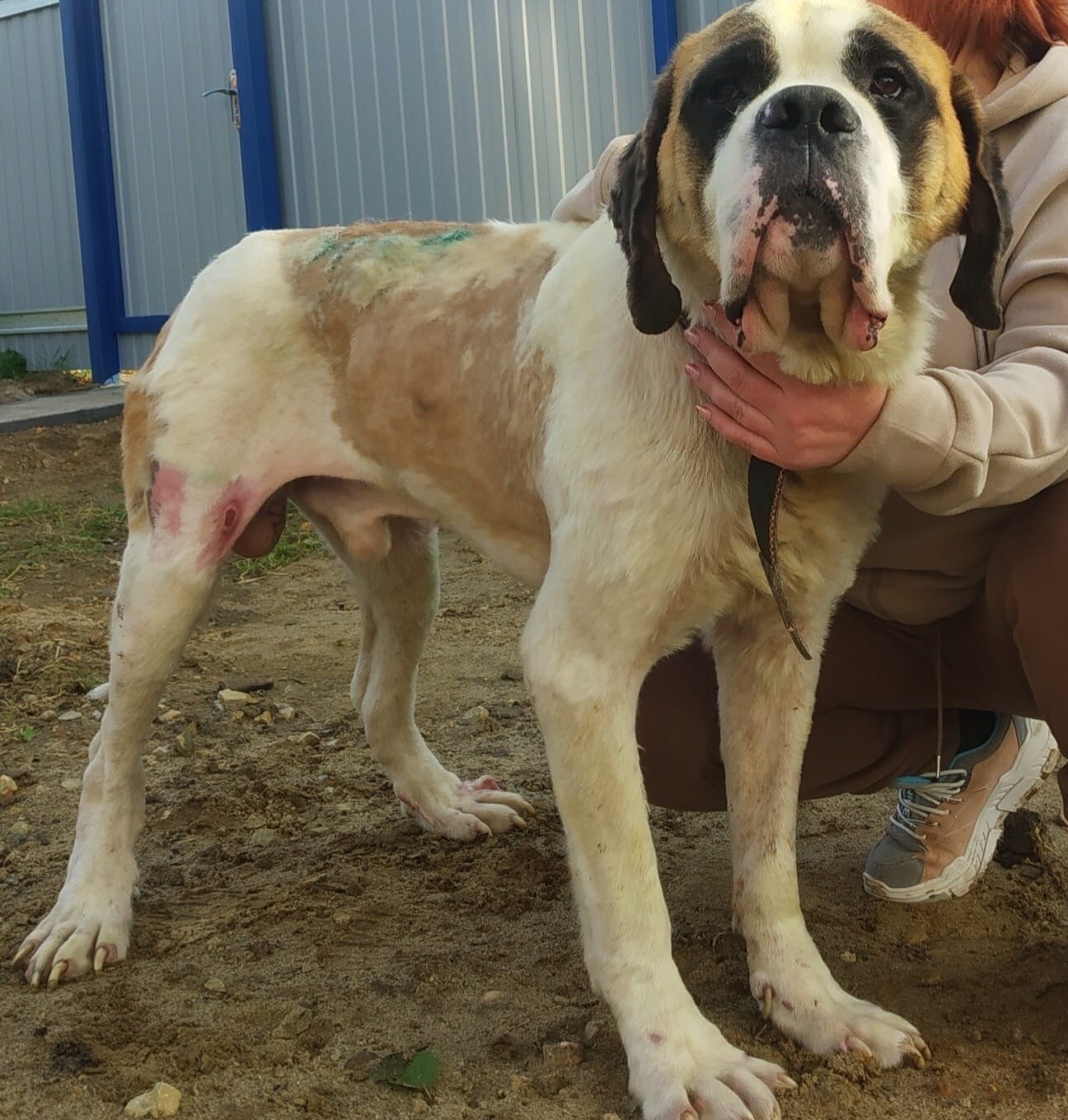 Для обгоревшего сенбернара, которого после пожара владельцы выбросили погибать на улицу, ищут новых хозяев. Волонтерам потребовался месяц, чтобы восстановить здоровье четвероногого подопечного.