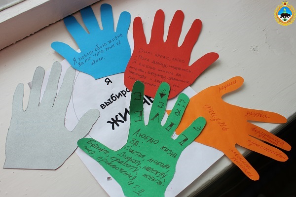 Участникам занятия было предложено проанализировать, а что для каждого из них значит "Жить (Жизнь)". Из цветного картона осужденные сделали свои индивидуальные трафареты ладони, в которые вписали результаты личных размышлений. Все ладошки были оформлены в коллаж, смысловое значение которого заключалось в одном - твоя жизнь в твоих руках.