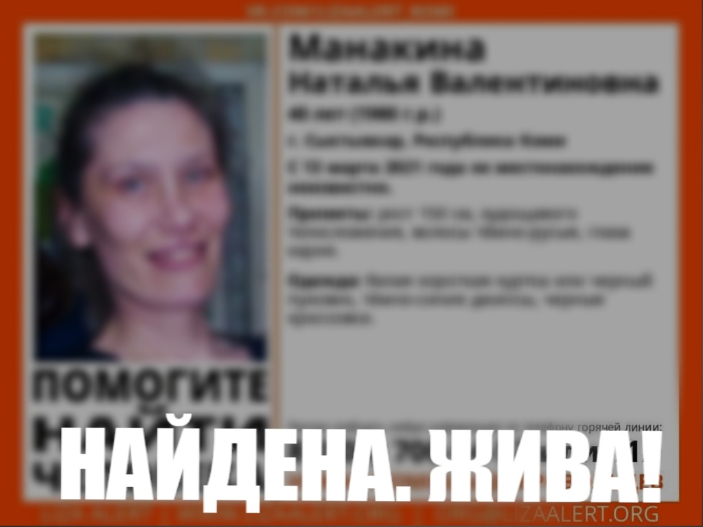 Пропавшая две недели назад сыктывкарка Наталья Манакина вернулась домой. Информацию о завершении ее поисков "Комиинформу" сообщили в поисковом отряде "Лиза Алерт".