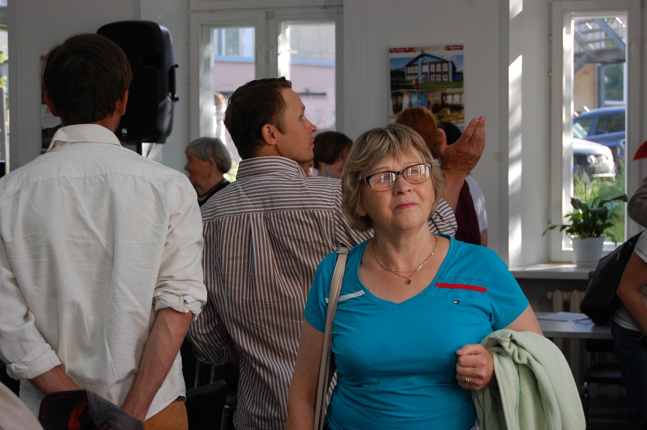 Рассказы участников презентации перемежались игрой. Зрителям нужно было угадать инструменты для строительства домов, которые были спрятаны в берестяном коробе. Гости справились с загадками, угадав багор (коми - багыр), скобель (гогын),лопатку для конопачения (тэльöб) и черту (черта). Причем с первыми двумя задачами легко справились женщины.