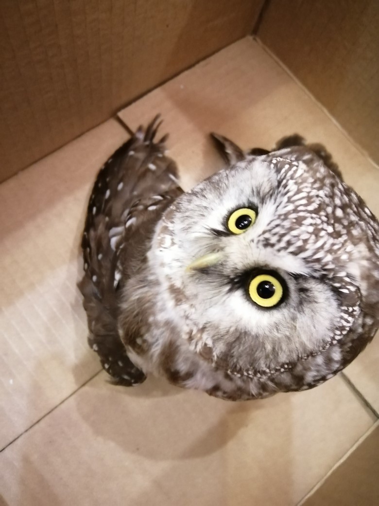В данный момент совенок прекрасно кушает, чувствует себя удовлетворительно и готов к дальней дороге. Дома держать лесную птицу нельзя, да и помощь врачей необходима срочно, промедление может вызвать сепсис и некроз.