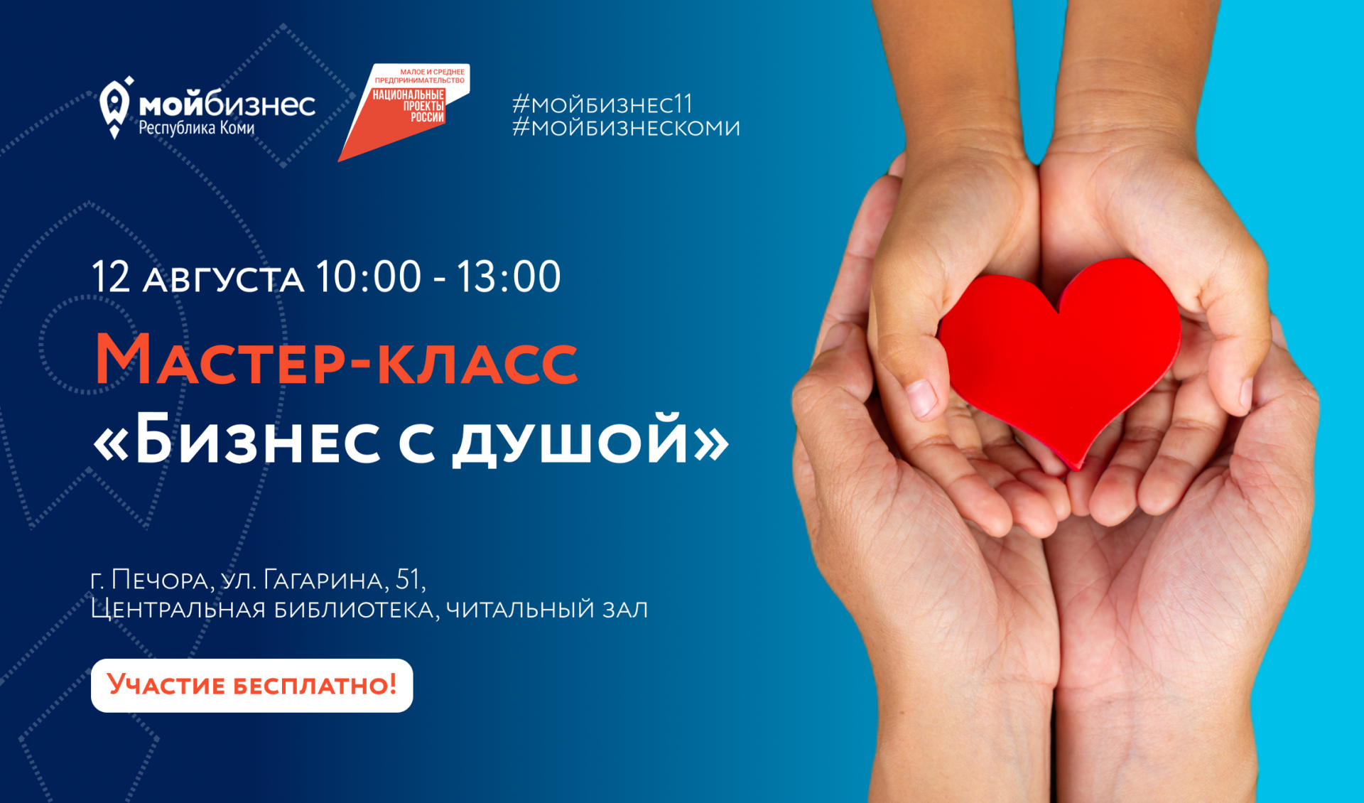Мастер-класс "Бизнес с душой" проводится "Мой бизнес" Коми в рамках реализации национального проекта "Малое и среднее предпринимательство и поддержка индивидуальной предпринимательской инициативы". Больше о бесплатных образовательных мероприятиях центра можно узнать в афише официального сообщества "Мой бизнес" Коми во "ВКонтакте" или на сайте мойбизнес11.рф в разделе "Мероприятия".