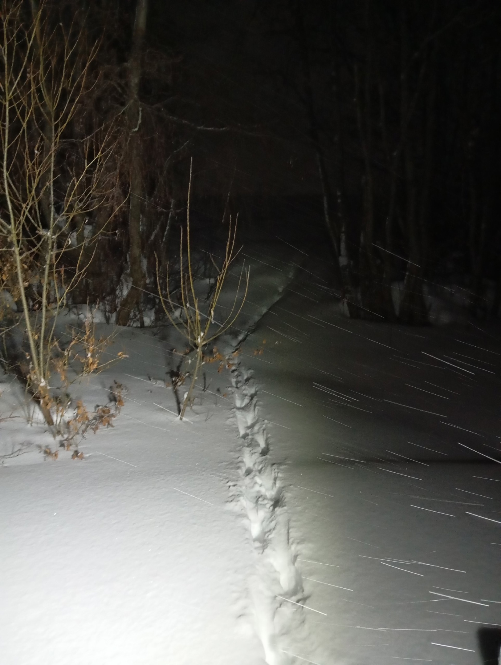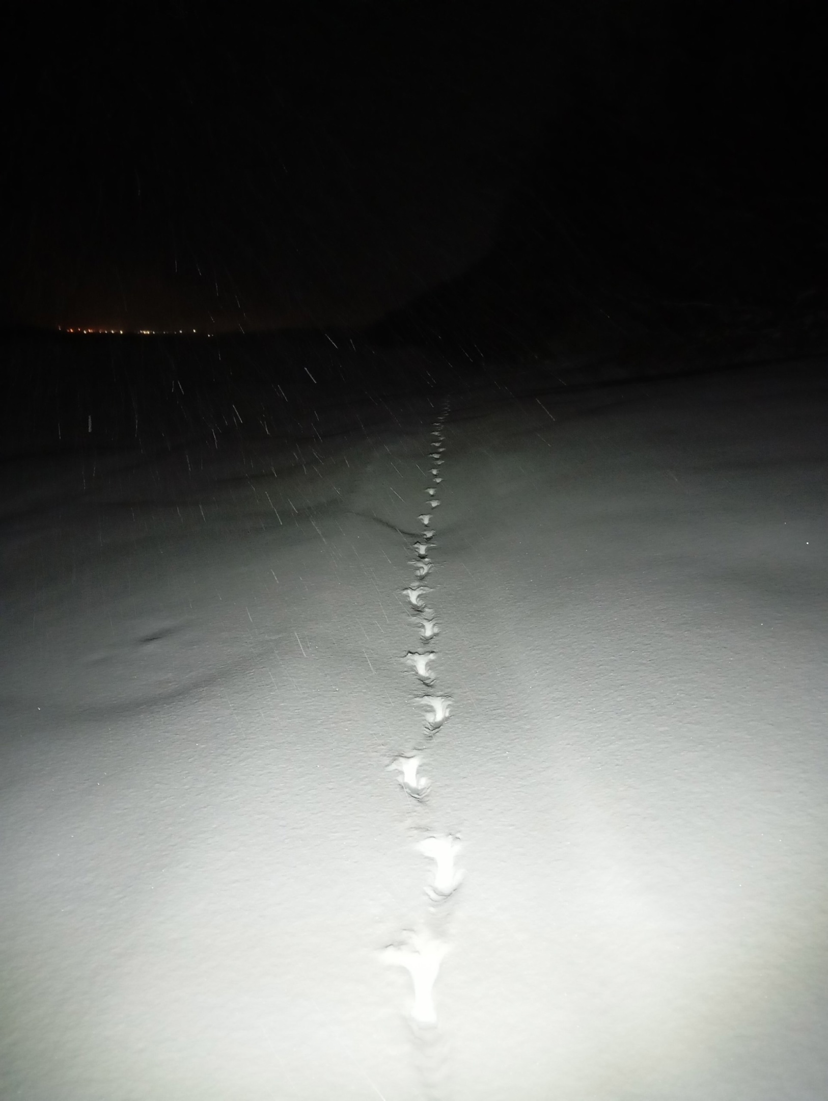Цепочка следов ведет от реки к жилому сектору с частными домами. По виду и расположению очевидцы предполагают, что из леса к поселку вышел волк за легкой добычей в виде хозяйских собак.