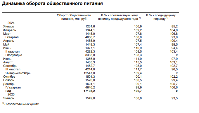 Сфера общественного питания демонстрирует уверенный рост: если в начале 2024 года месячный оборот составлял около 1,3 миллиарда рублей, то к концу года он превысил 1,6 миллиарда рублей.