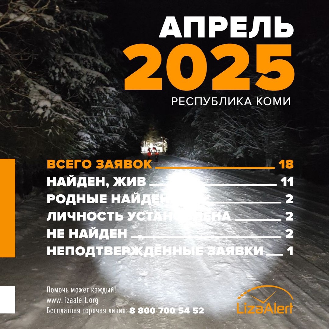 18 заявок поступило в поисковый отряд "ЛизаАлерт" Республики Коми за апрель 2025 года. Среди них была одна заявка на поиск несовершеннолетнего, сообщили волонтеры организации.