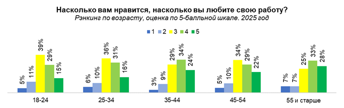 В разрезе возраста больше других любят свою текущую работу респонденты 55 лет и старше (сразу 28% поставили 5 баллов), а вот среди молодежи (от 18 до 24 лет) таких лишь 15%. В свою очередь среди молодежи преобладает средняя оценка (39% поставивших 3 балла из 5).