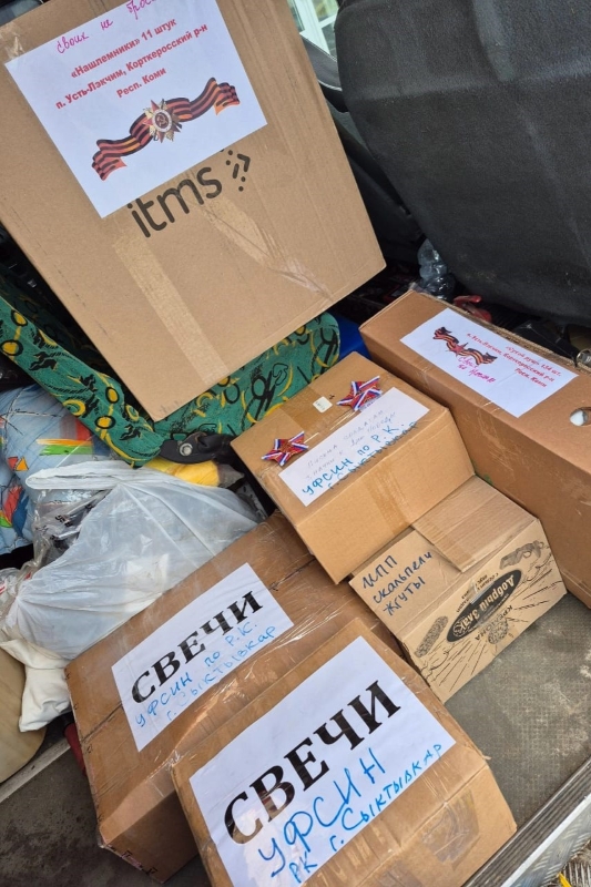 К дате выезда гуманитарного конвоя волонтер УИС сделала порядка 200 блиндажных свечей, а также специально к празднованию Дня Победы изготовила 150 значков, выполненных из георгиевских ленточек в форме звезд. Кроме того, полсотни писем-треугольничков со словами благодарности и поддержки подготовили дети работников сыктывкарских подразделений УФСИН.
