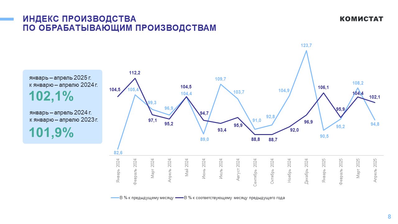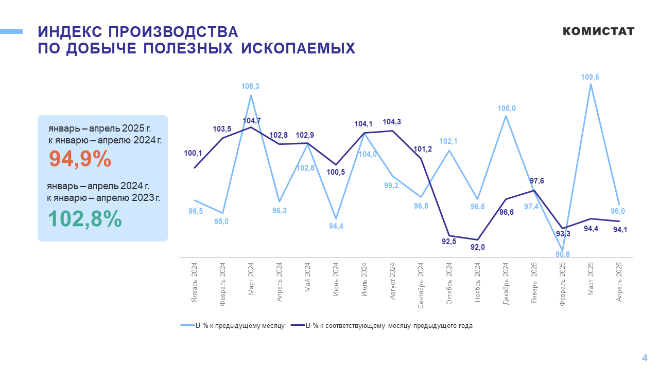В Коми индекс промышленного производства в январе-апреле 2025 года составил 96,3% по сравнению с аналогичным периодом прошлого года, когда показатель достигал 102,4%. Об этом сообщает Комистат.