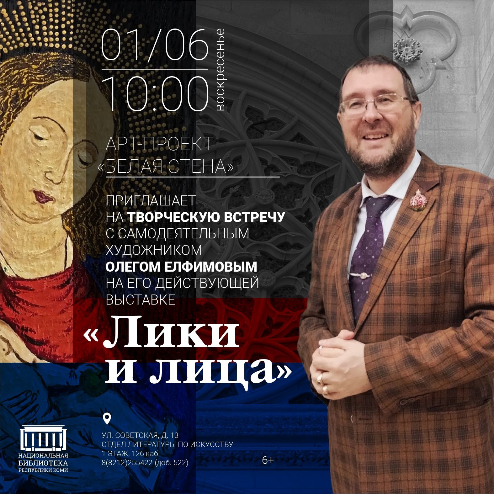 Национальная библиотека Республики Коми приглашает в 10:00 на творческую встречу с самодеятельным художником Олегом Елфимовым на его выставке "Лики и лица" (6+).
