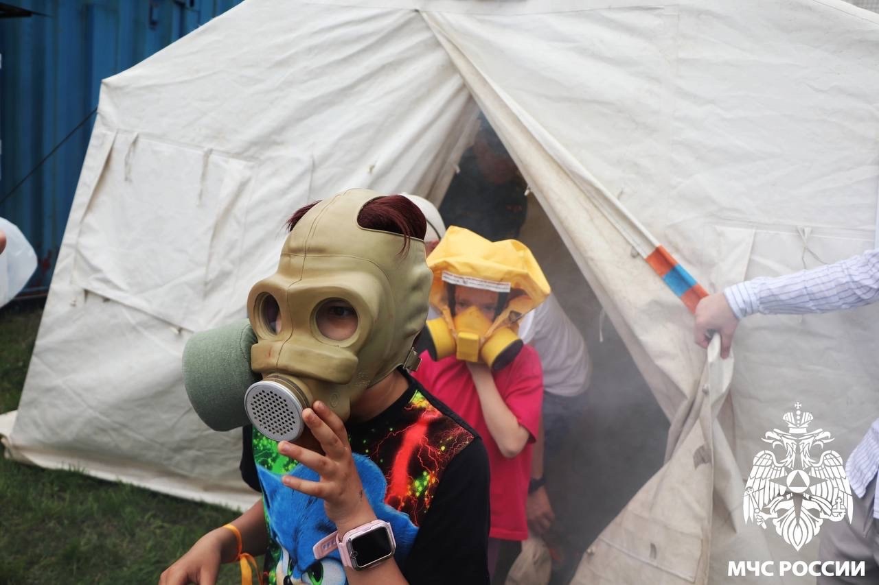Команда "Газы" - станция, где ребят научили надевать и пользоваться противогазами, а также провели конкурс, в ходе которого необходимо было найти и спасти пострадавшего в задымленной палатке.