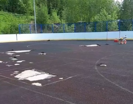 На площадку уже завезена резиновая крошка и специальный клей. Ведутся работы по очистке бетонного основания площадки от мелкого мусора.