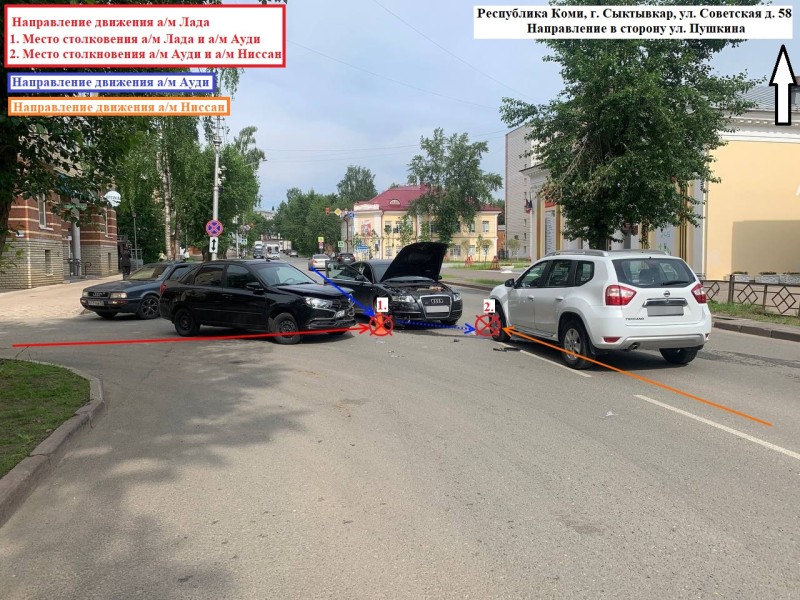 Как сообщили "Комиинформу" в Управлении Госавтоинспекции по Коми, первое происшествие зарегистрировано в 8:30. 22-летняя девушка, управляя автомобилем Lada Granta, выезжала с дворовой территории дома №58 по ул.Советской. Не предоставив преимущество движущемуся по ул.Советской автомобилю, водитель "Лады" столкнулась с Audi A6. После этого Audi A6 врезался в ехавший навстречу Nissan Terrano.