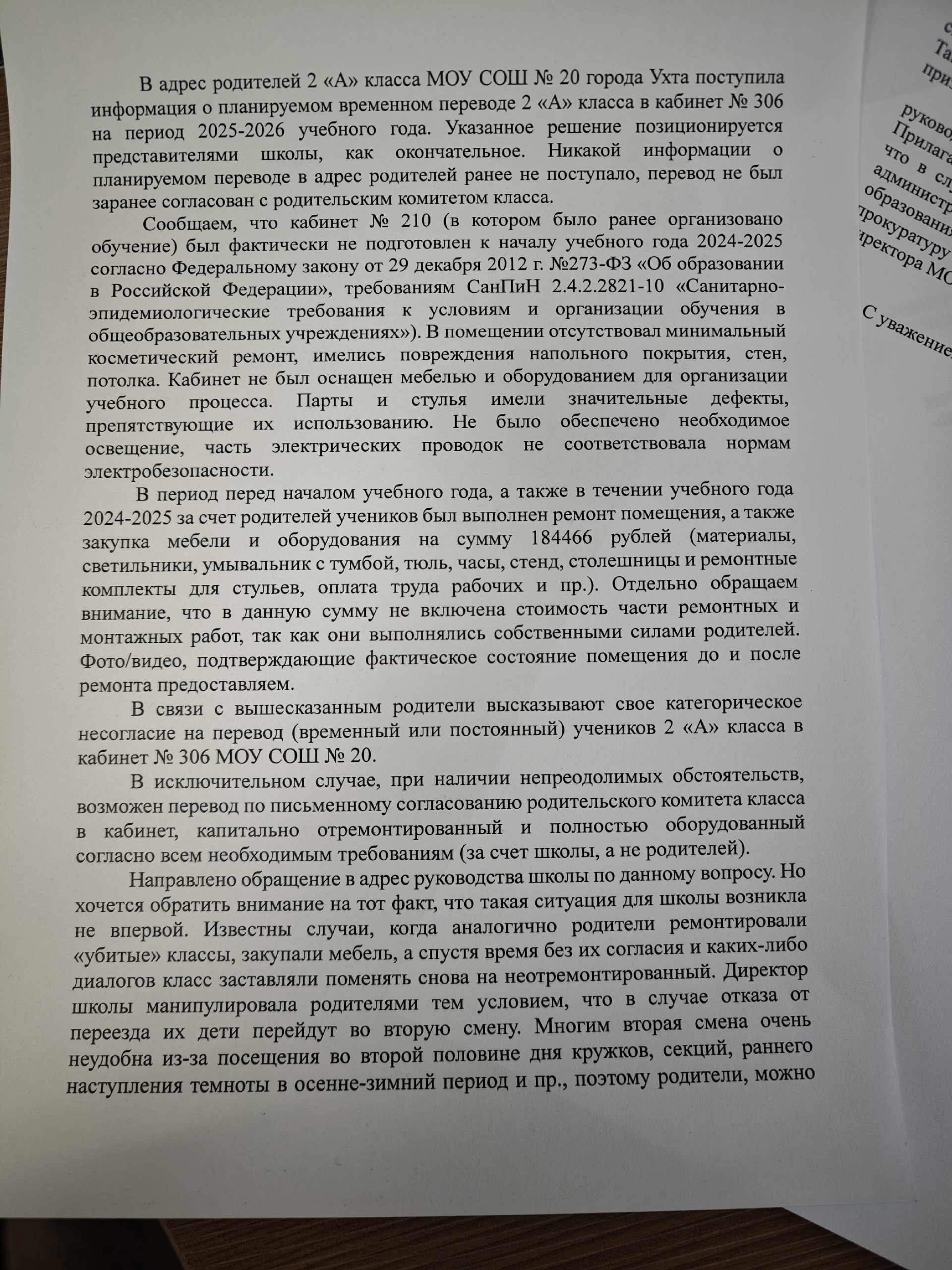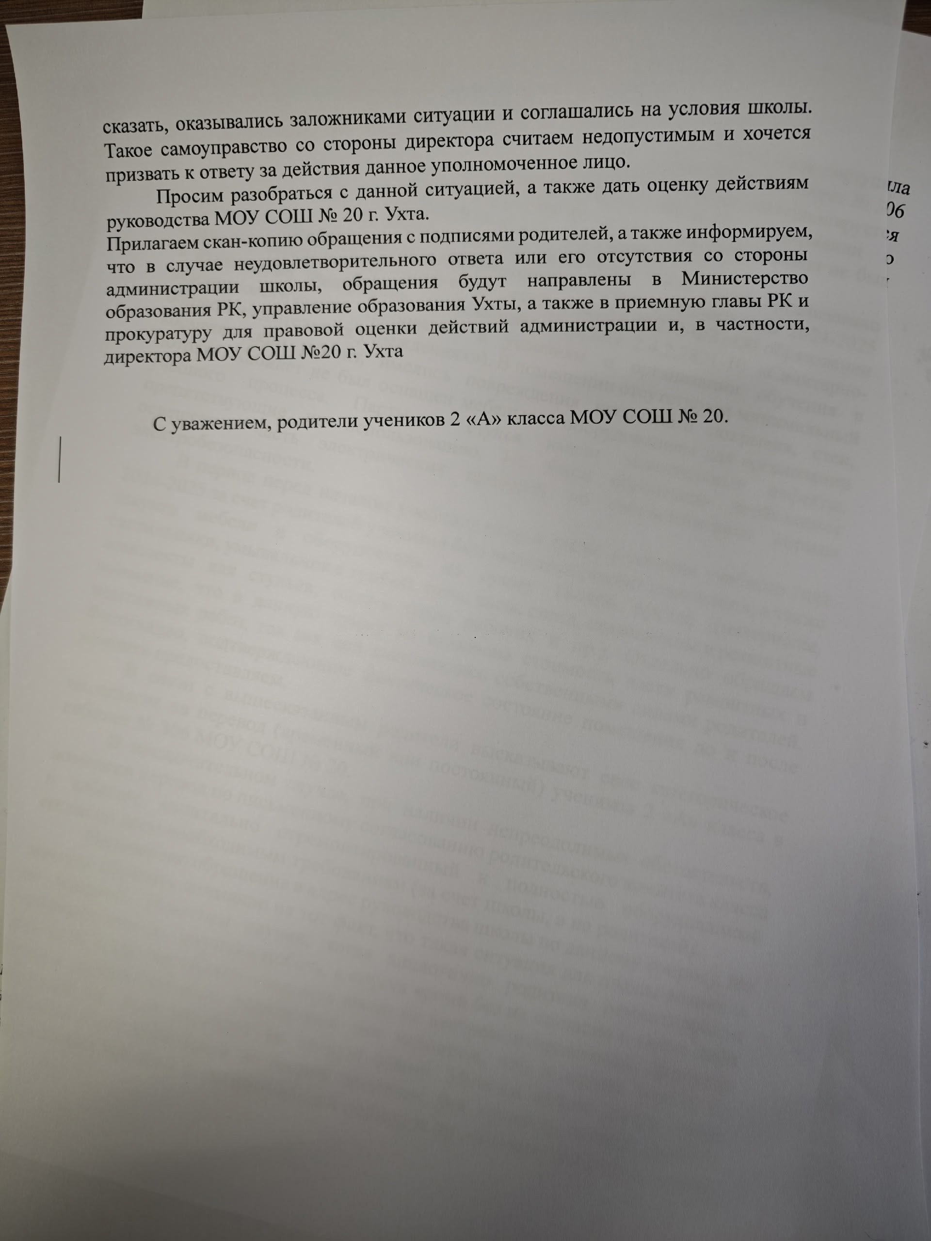 Родители направили обращение руководству школы и планируют обратиться в Министерство образования РК, управление образования Ухты, а также в приемную главы РК и прокуратуру.