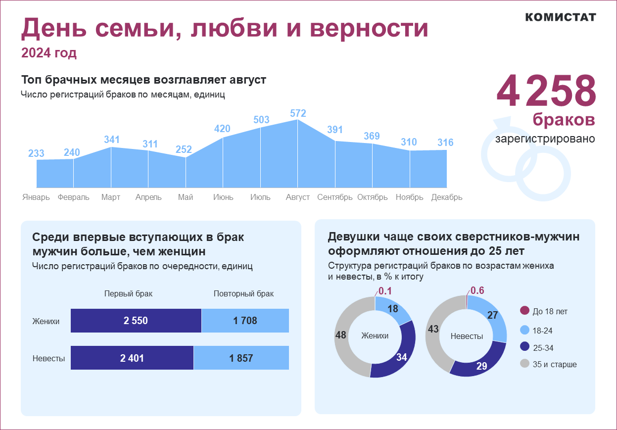 В 2024 году в Республике Коми в брачный союз вступили 4,3 тысячи пар. Большую часть свадеб сыграли летом – 1,5 тысячи (35% браков). Самым "жарким" месяцем для работников ЗАГС стал август, они провели 572 регистрации.