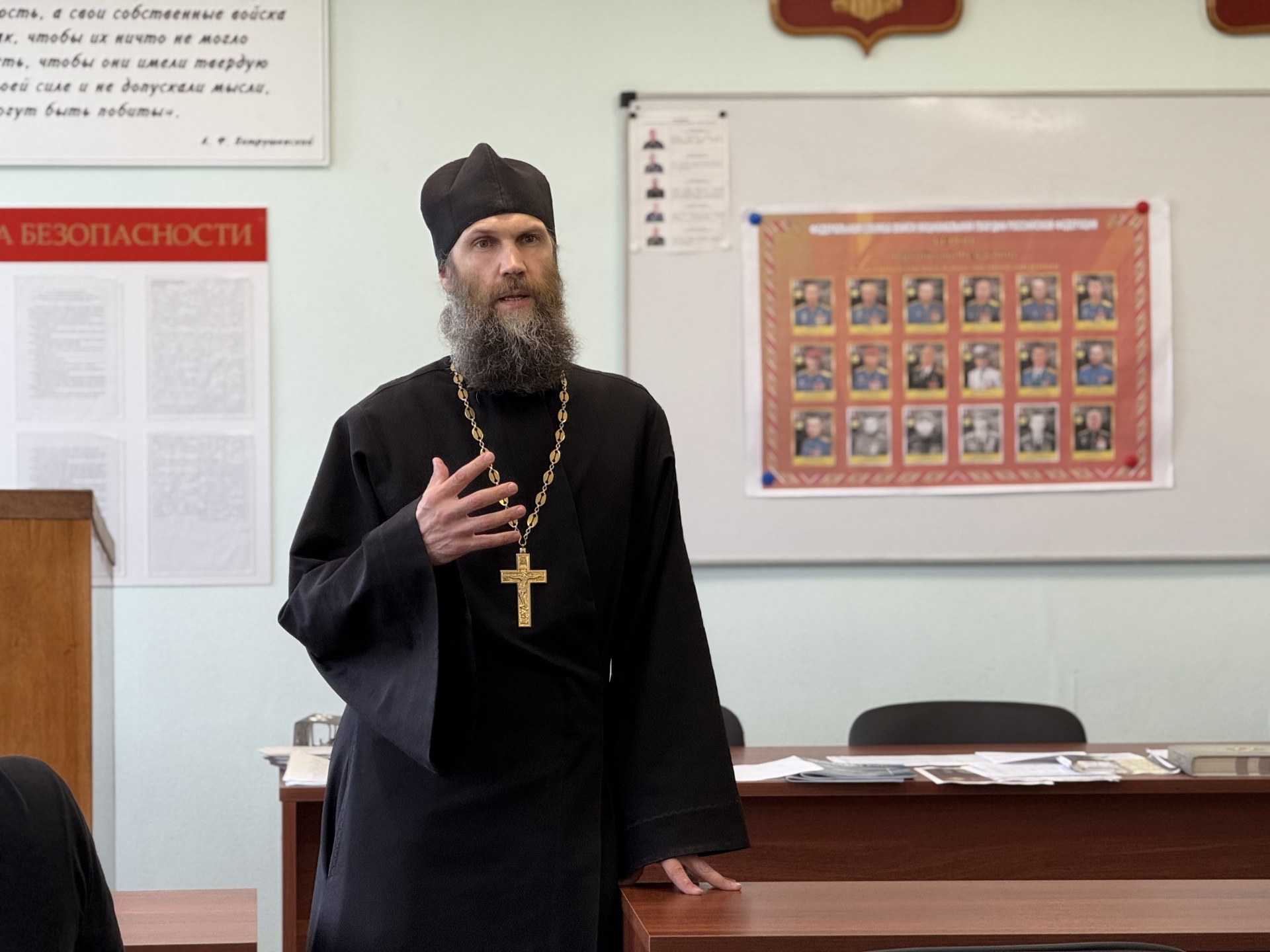 Во время встречи иерей Максим рассказал росгвардейцам об истории христианства на Руси, о святом равноапостольном князе Владимире, о принятии им православной веры и его роли в Крещении Руси, на века вперед предопределившего духовную судьбу Русской Православной Церкви и русского православного народа.