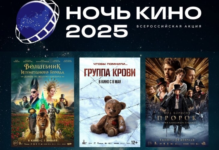 В программу "Ночи кино 2025" войдут: военная драма в честь 80-летия Победы в Великой Отечественной войне – "Группа крови" (2025, реж. Максим Бриус), семейное фэнтези "Волшебник Изумрудного города. Дорога из желтого кирпича" (2024, реж. Игорь Волошин) и музыкальный байопик "Пророк. История Александра Пушкина" (2024, реж. Феликс Умаров).