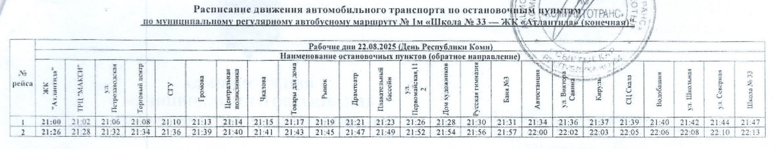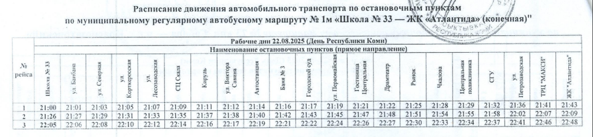 По маршруту №1м "Школа №33 - ЖК "Атлантида" (конечная)" от остановочного пункта "Школа №33" в прямом направлении дополнительные рейсы в 21:00; 21:26; 22:05, а также в обратном направлении от остановочного пункта "ЖК "Атлантида"(конечная)" дополнительные рейсы в 21:00; 21:26.