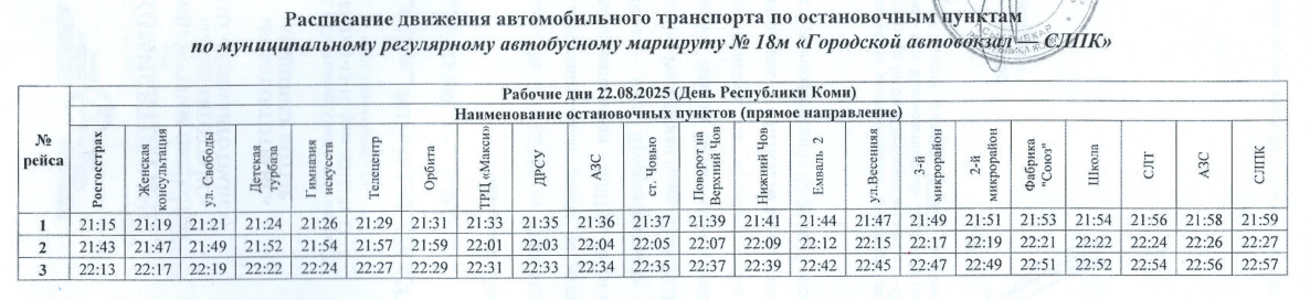 По маршруту №18м "Городской автовокзал -СЛПК" от остановочного пункта "Росгосстрах" в прямом направлении дополнительные рейсы в 21:15; 21:43; 22:13.