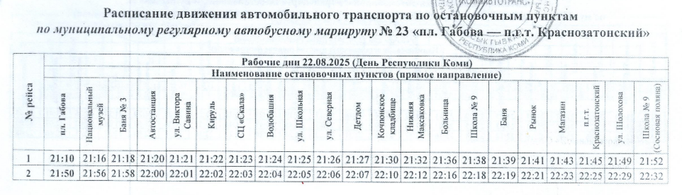 По маршруту №23 "пл.им.Габова - п.г.т. Краснозатонский" в прямом направлении от остановочного пункта "пл.им.Габова" дополнительные рейсы в 21:10; 21:50.