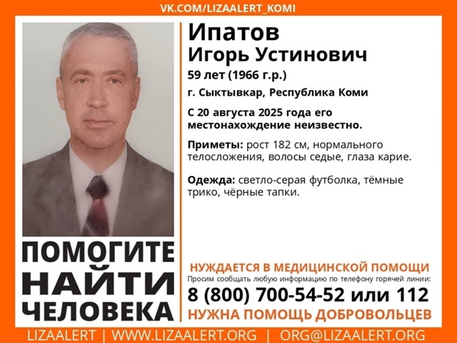 В Сыктывкаре организованы поиски 59-летнего Игоря Ипатова.