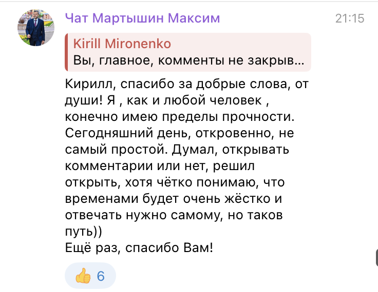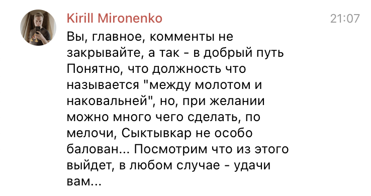 "Комиинформ" проанализировал, с каким настроением встречают горожане нового руководителя мэрии, что их волнует и решения каких вопросов они ждут. М.Мартышин активно вступил в диалог с сыктывкарцами, отвечал почти на каждый комментарий, хотя признал, что это было непросто.