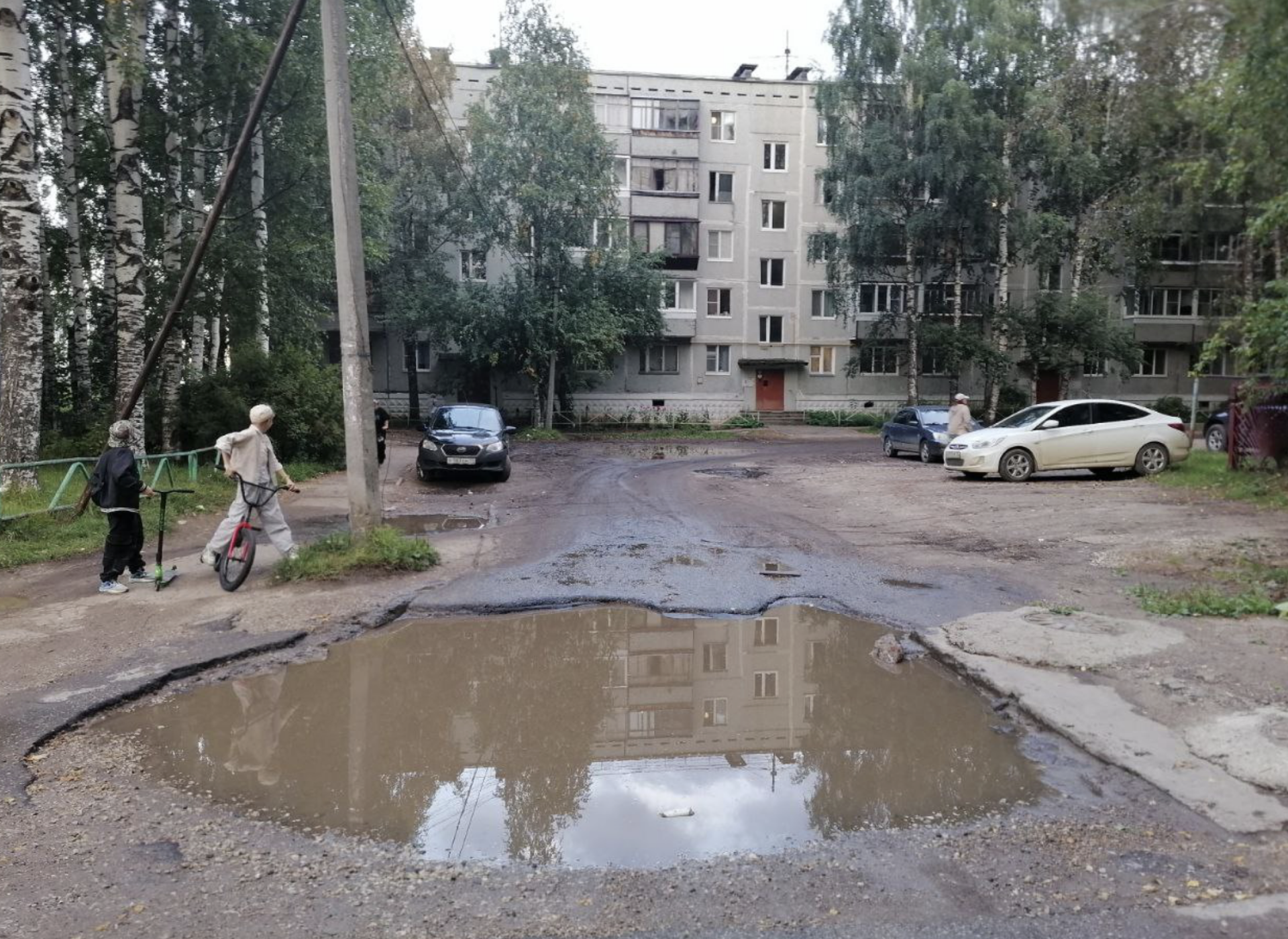"Участок дворовых территорий Печорская 2 и 4-6. В связи с отсутствием ливнёвки, вода постоянно скапливается в большие лужи, разрушая асфальтовое покрытие проезда. Из лужи вода утекает под дома".