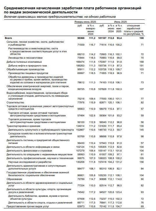 В Коми в июне 2025 года среднемесячная номинальная начисленная заработная плата составила 101 187 рублей, что на 13% больше, чем год назад.