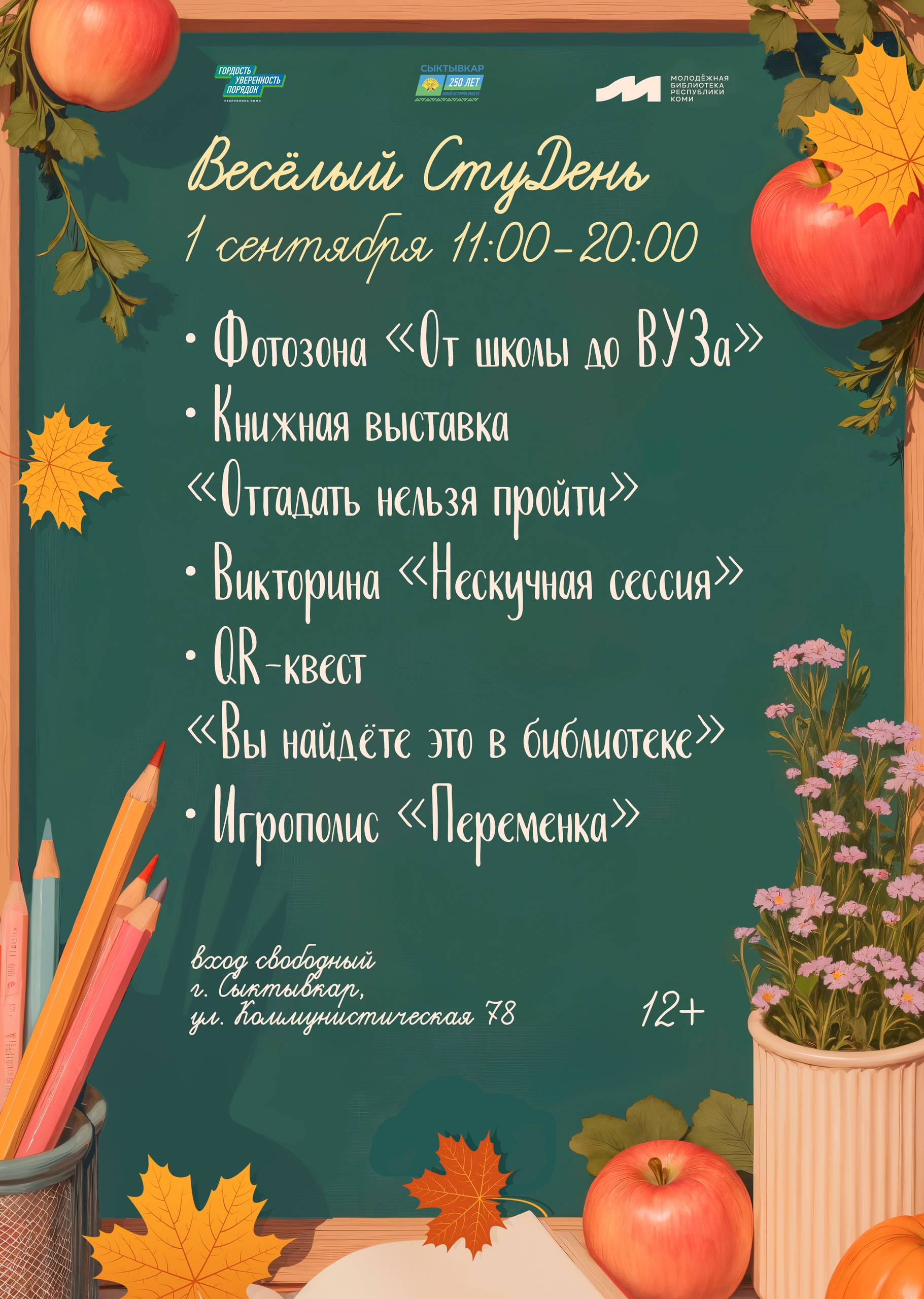 Ко Дню Знаний Молодёжная библиотека Республики Коми проводит акцию "Весёлый СтуДень". Участники не только весело встретят первый день осени, но и настроятся на учёбу.