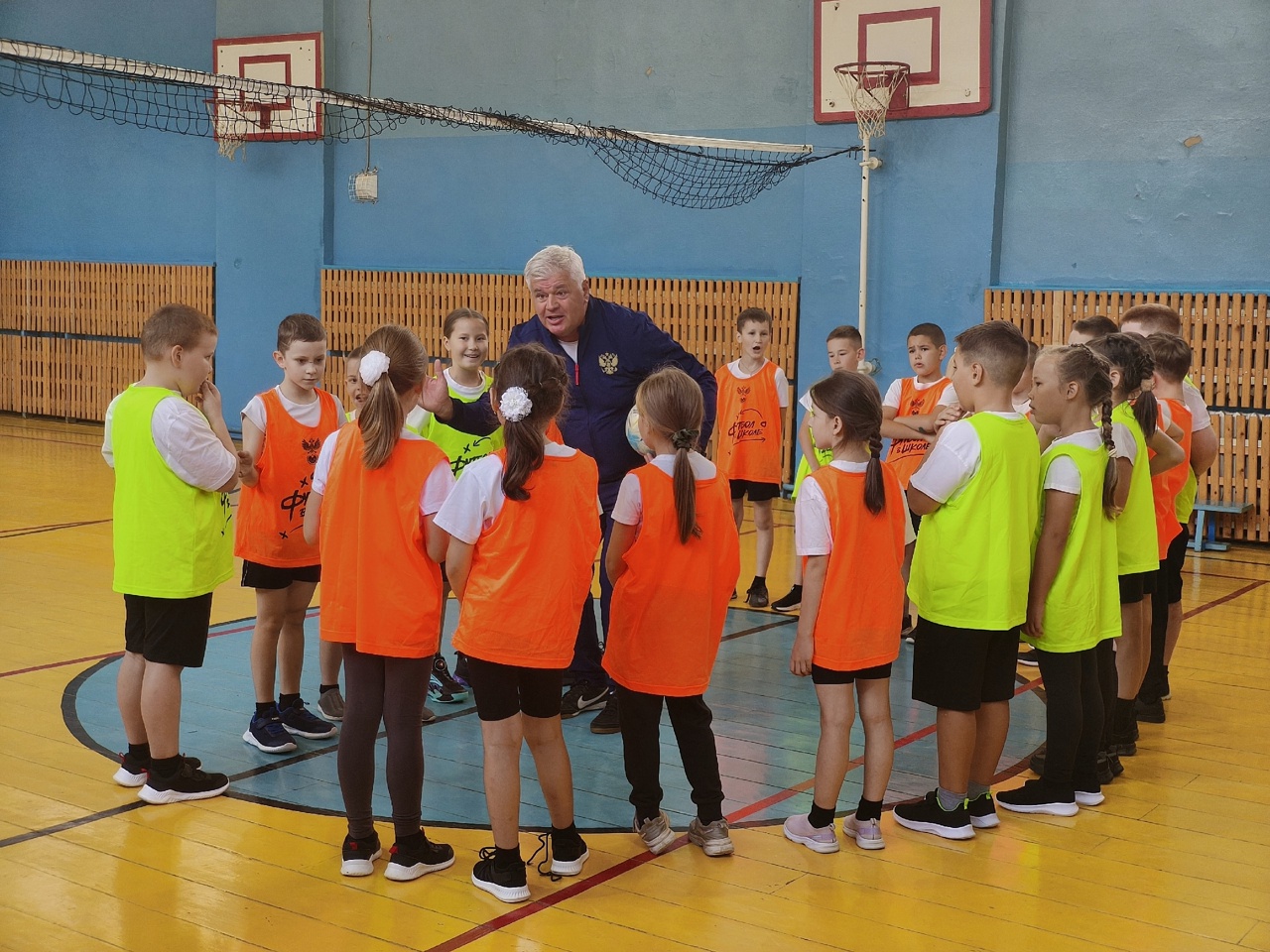 На школьном уроке физкультуры чемпион СССР Дмитрий Баранник объяснил, как отрабатывать навыки ведения мяча, а учителям, как правильно тренировать детей.