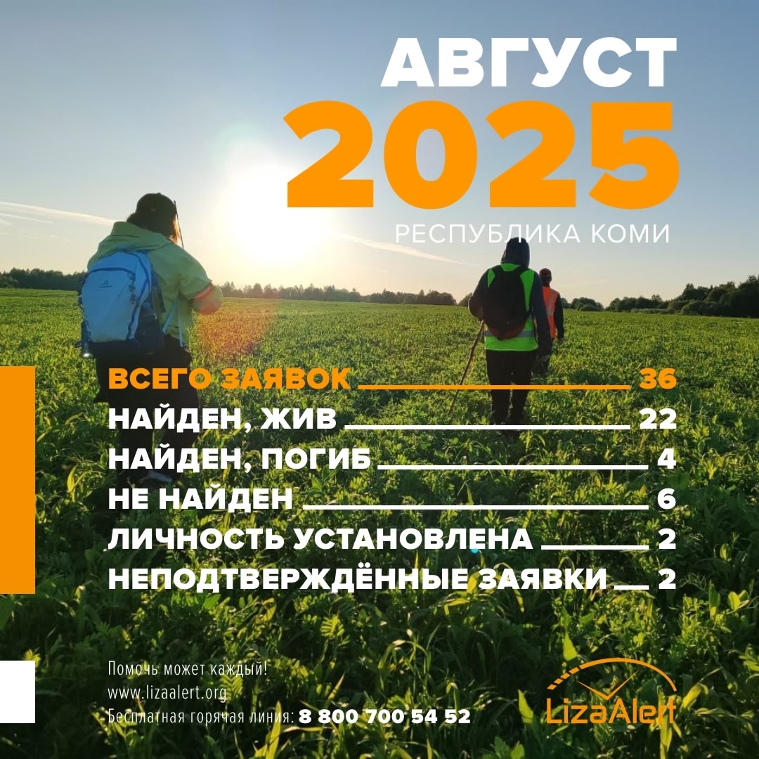 36 заявок поступило в поисковый отряд "ЛизаАлерт" Республики Коми за август 2025 года. Среди них было пять заявок на поиск несовершеннолетних, сообщили волонтеры организации.