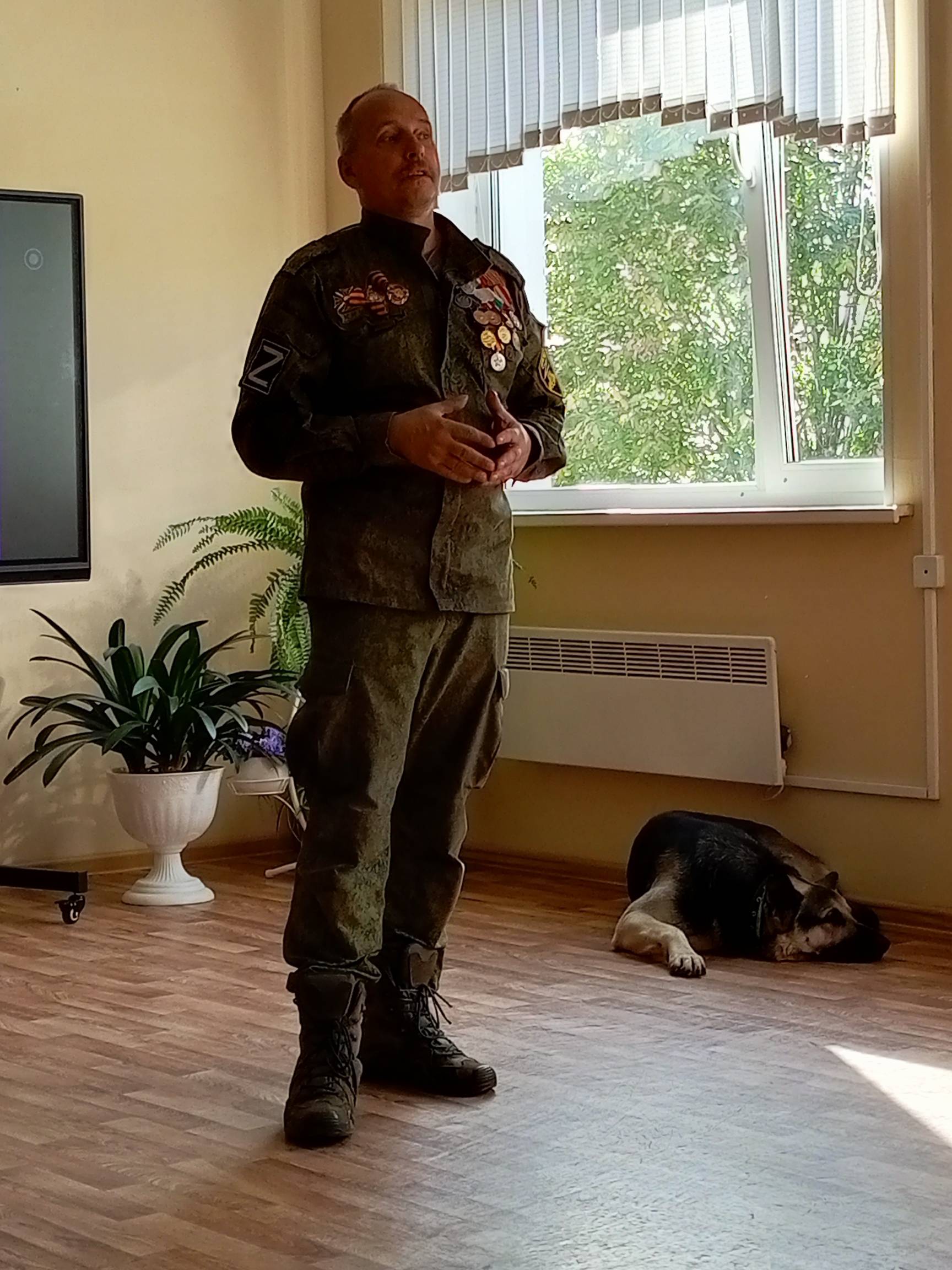 Также большой интерес вызвала беседа с участниками СВО Андреем Мухиным и Михаилом Лебедевым - они поделились рассказами о мужестве наших воинов и вспомнили, что помогает выжить солдату в трудных ситуациях на фронте. Встречу посетил и пес Черкес - тоже участник СВО. Он демонстрировал свои умения, потрясающее спокойствие и дружелюбие к детворе, хотя уже дважды побывал на линии фронта и успел пройти боевое крещение.