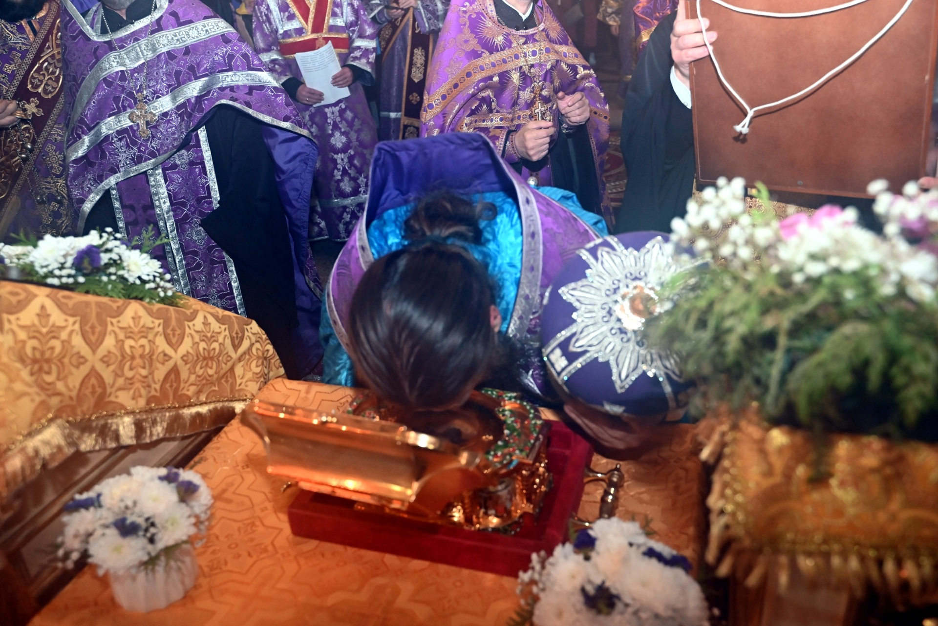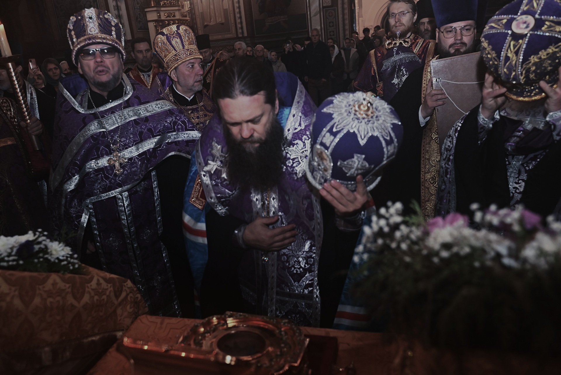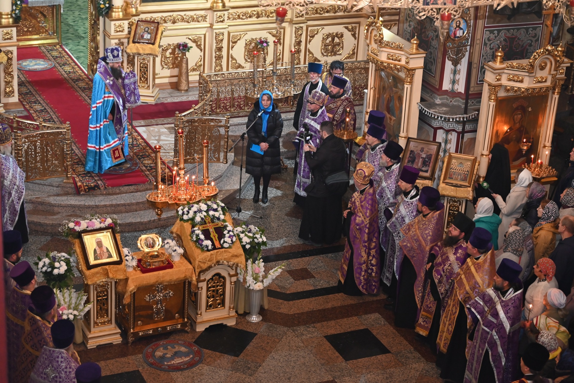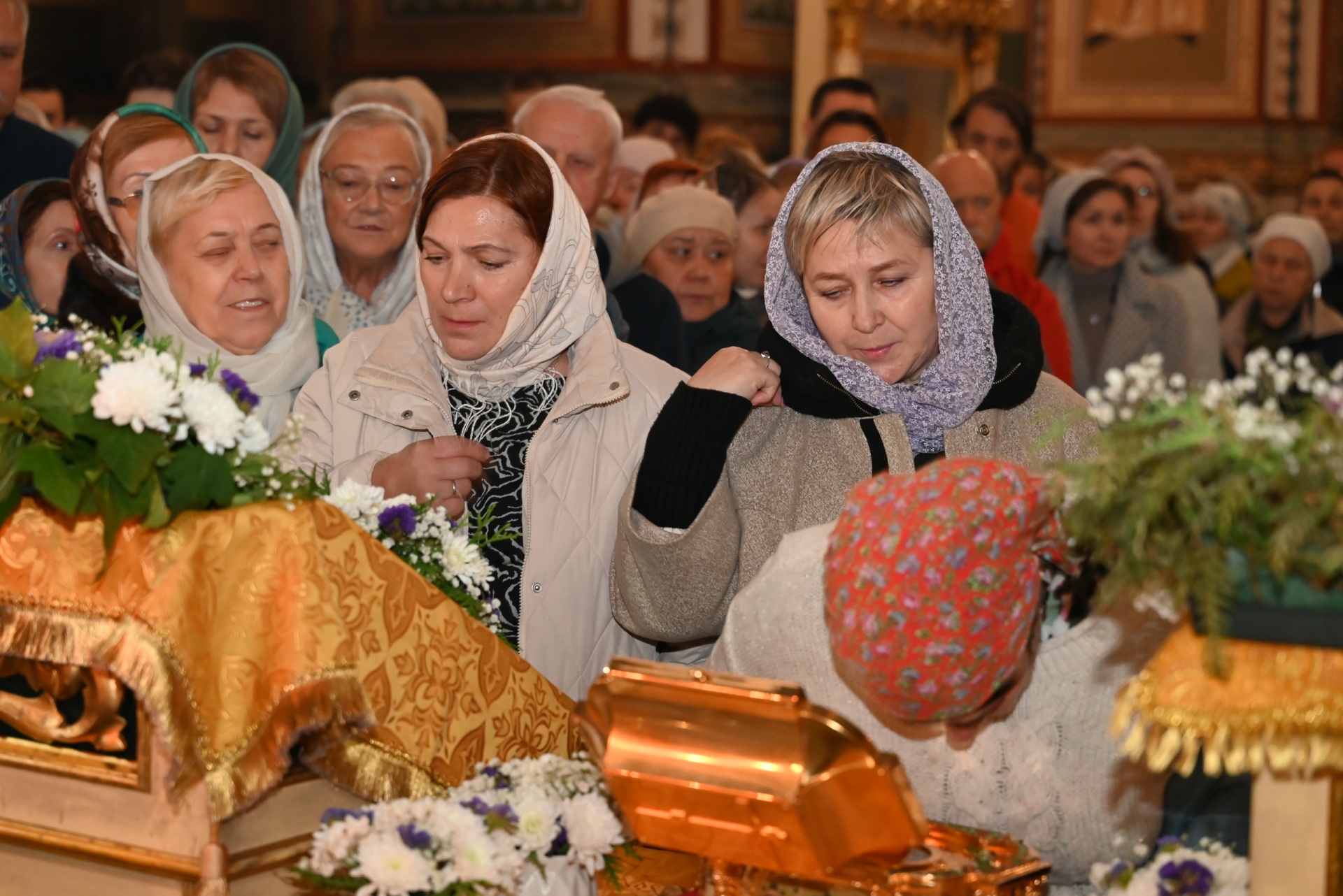 Владыка Филипп совершил краткий молебен, благословил народ мощами и обратился к пастве с приветственным словом. Он подчеркнул особую духовную радость от прибытия святыни в наши земли и призвал верующих обязательно прийти к мощам великого угодника Божия, чтобы испросить его молитвенной помощи, а также привести детей для благословения.