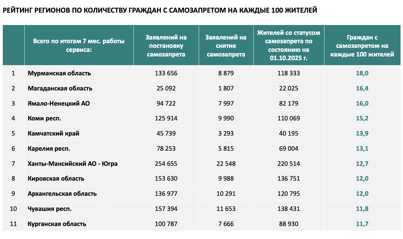 В рейтинге регионов России по количеству граждан с самозапретом на каждые 100 жителей Коми находится на 4 месте. Самозапрет установлен у 15,2 жителей из 100.