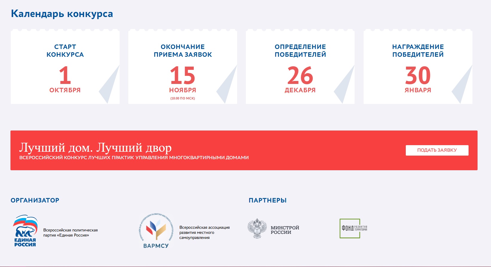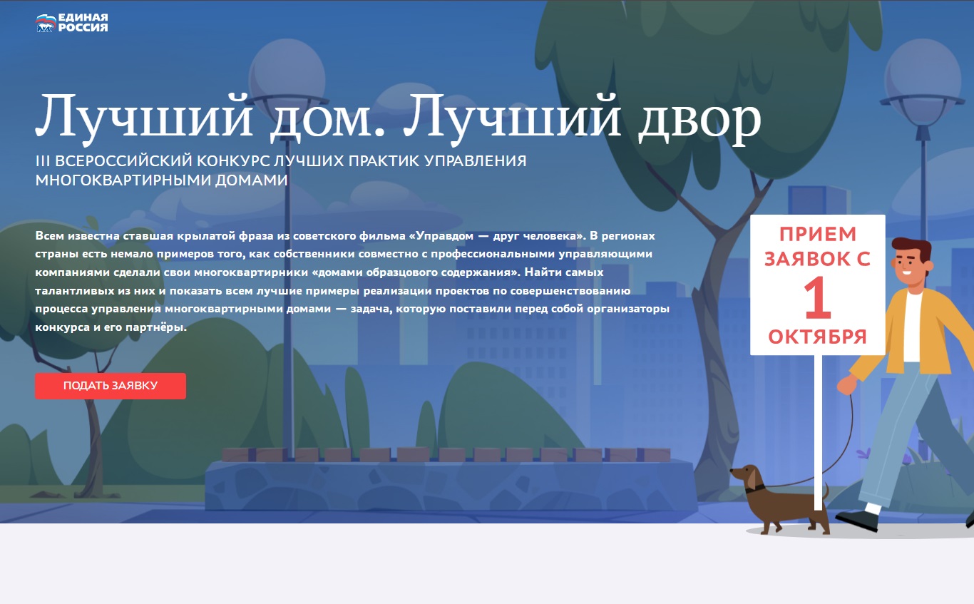 Партия "Единая Россия" организует конкурс "Лучший дом. Лучший двор" в рамках реализации народной программы, а также партийных проектов "Школа ЖКХ" и "Городская среда". Проведение конкурса поддерживает Минстрой России, Фонд развития территорий и Всероссийская ассоциация развития местного самоуправления.