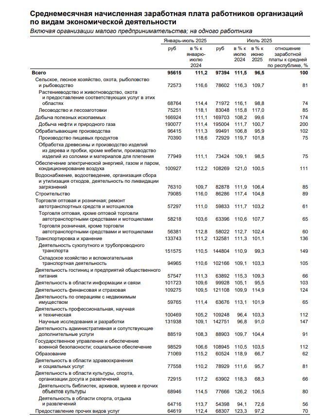 В Коми в июле 2025г. среднемесячная начисленная заработная плата составила 97 394 рубля, что на 11,5% больше, чем за аналогичный период прошлого года.