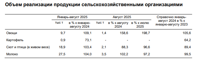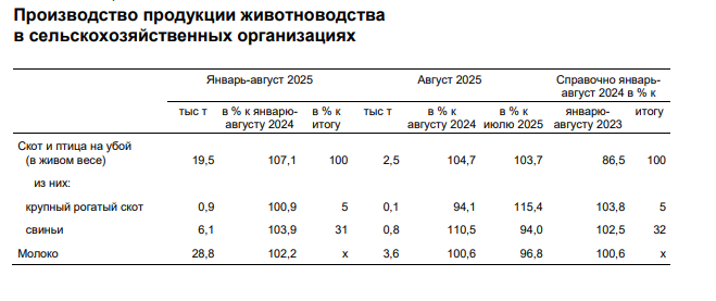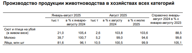 За первые восемь месяцев 2025 года в хозяйствах всех категорий было произведено 21,0 тысячи тонн скота и птицы на убой в живом весе, что на 5,4% больше аналогичного периода 2024 года. Объем производства молока составил 39,7 тысячи тонн (рост на 0,7%), яиц — 81,6 миллиона штук (снижение на 3,9%).
