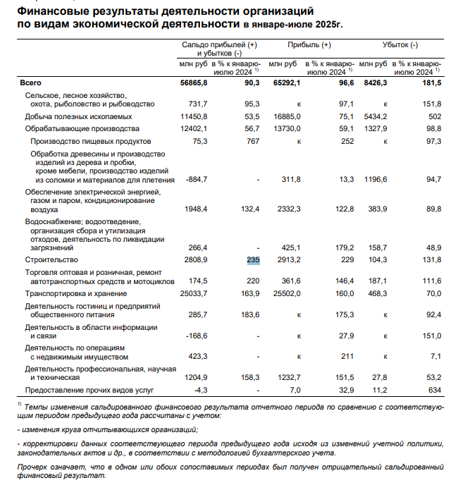 Лидерами по формированию положительного финансового результата стали: сектор транспортировки и хранения с показателем 25 миллиардов рублей (рост на 63,9%), добыча полезных ископаемых — 11,5 миллиарда рублей, а также обрабатывающие производства — 12,4 миллиарда рублей. В строительном секторе зафиксирован рост прибыли до 2,8 миллиарда рублей (увеличение на 135%).