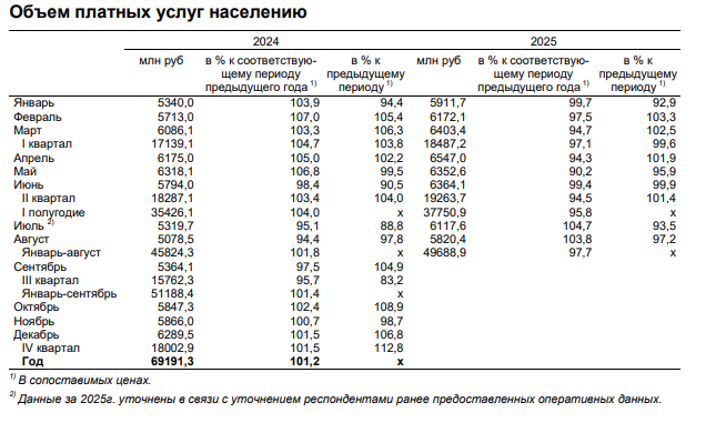 В августе население региона потратило на платные услуги 5,8 миллиарда рублей, что в сопоставимых ценах на 3,8% больше, чем в августе прошлого года. Такие данные приводит Комистат в докладе о социально-экономическом положении Республики Коми за январь-август 2025 года.
