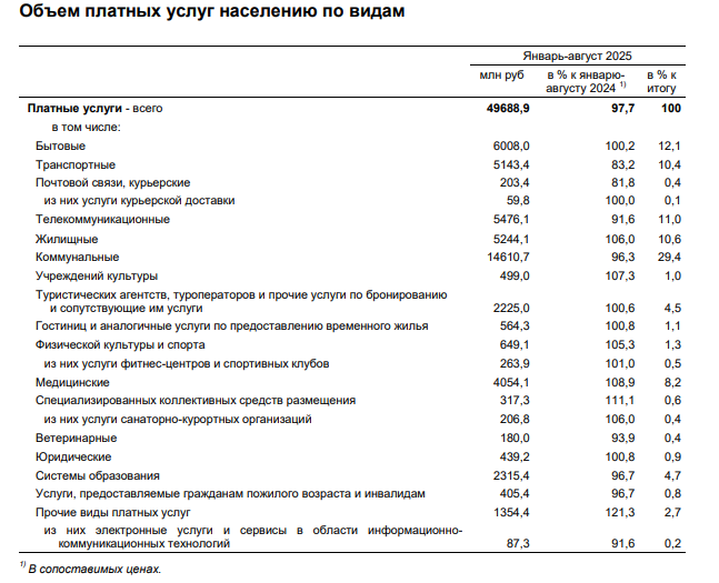 В январе-августе платных услуг было оказано на 49,7 миллиарда рублей, или 97,7% к уровню соответствующего периода предыдущего года.