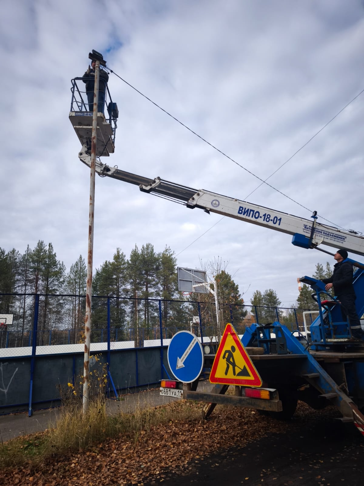 Кроме того, в Емве продолжаются работы по техническому обслуживанию линий электропередач на улицах города. Специалисты "Энергокомплекта" произвели обследование уличной сети, выявив неработающие фонари, и оперативно провели необходимые работы.