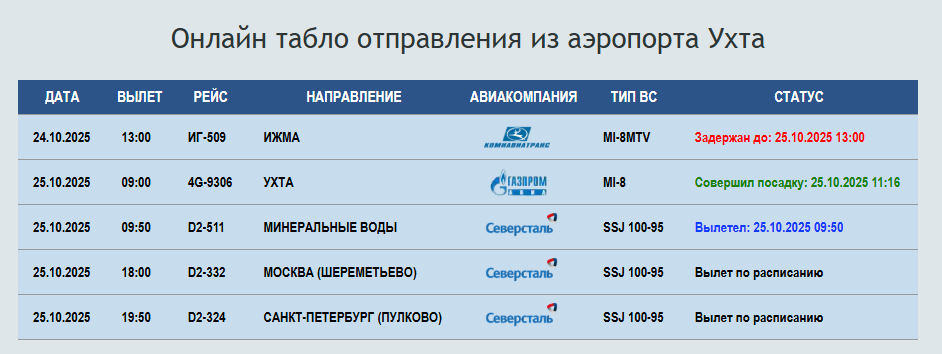 Согласно онлайн-табло, которое размещено на сайте аэропорта Ухты, по состоянию на 12:35 вылет и прибытие некоторых рейсов скорректирован.