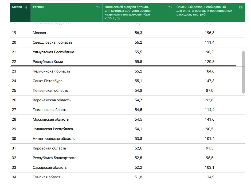 Семье из Коми для оплаты аренды и повседневных расходов в месяц необходимо 120,8 тыс. руб.  Для сравнения: в прошлом году регион занимал 18-е место в рейтинге регионов России по доступности аренды жилья.