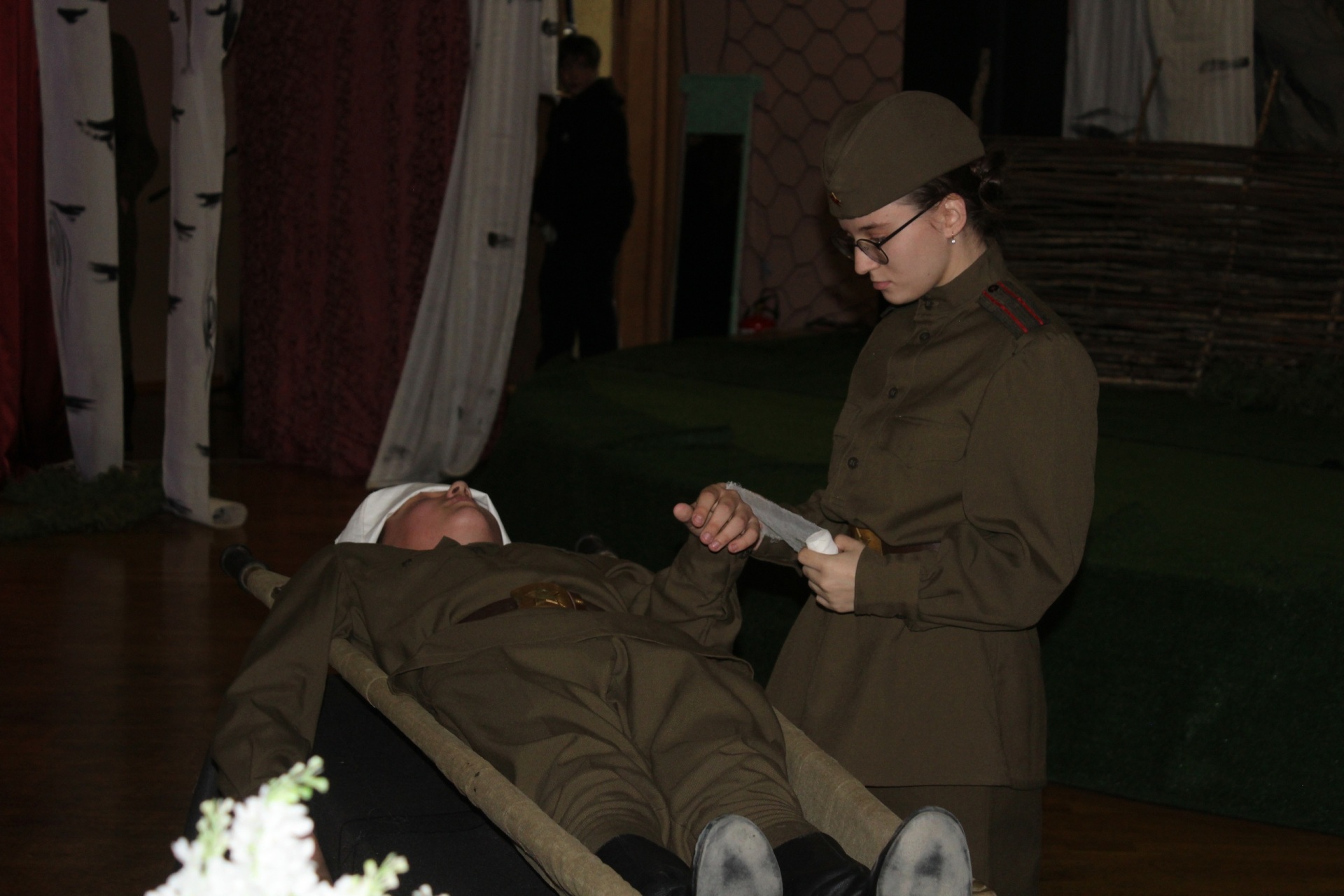 Самая пронзительная часть постановки - сцена полевого госпиталя. Две медсестры перевязывают раненых, борются со страхом и усталостью. Их диалог будто вырезан из фронтовых дневников. Актрисы не играют - они живут на сцене. И зритель понимает: в этой войне не было статистов. Каждый - герой.
