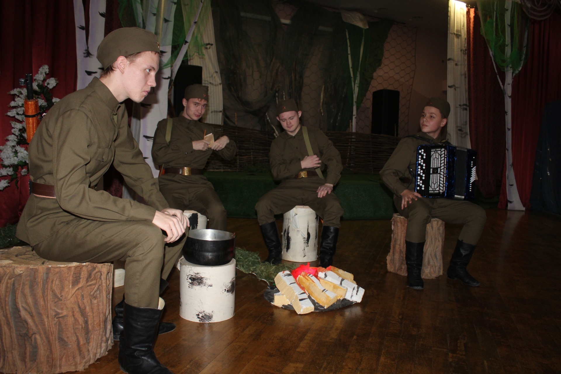 Во втором блоке спектакля сцена превращается в привал. Солдаты сидят у костра, вспоминают свои города - Ухту, Усть-Сысольск, Вычегду. Один мечтает о рыбалке, другой о запахе теста, третий чинит ремень и молча смотрит в огонь. Их разговоры просты, но за каждым словом - тоска по дому и вера, что обязательно вернутся.