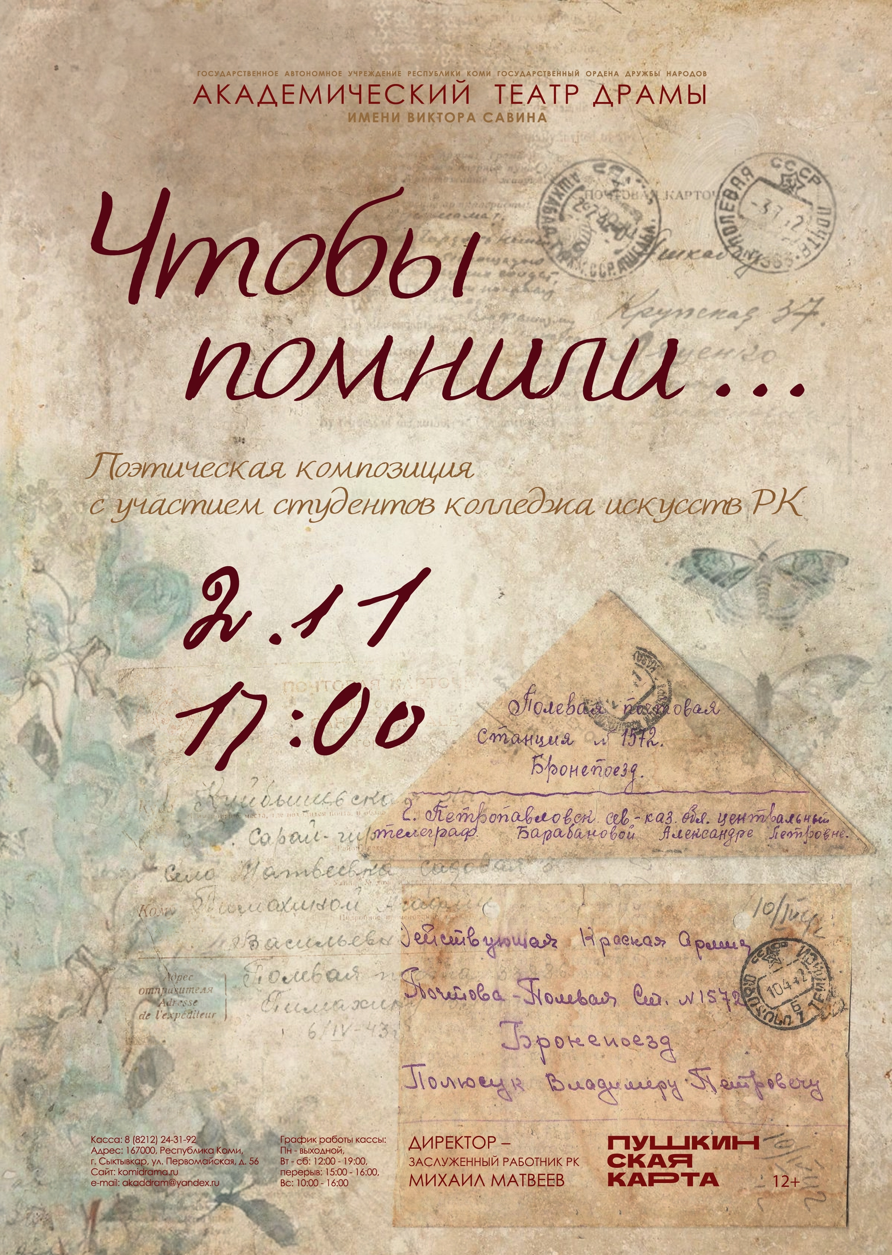 Академический театр драмы им. В. Савина приглашает в 17:00 на постановку, посвящённую 80-летию Великой Победы "Чтобы помнили..." (12+).